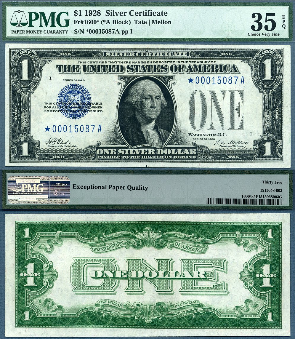 Consecutive Pair of 1928 $1 Silver Certificate Star Notes FR-1600* PMG Graded Choice Very Fine 35EPQ S/N *00015087A and *0015088A