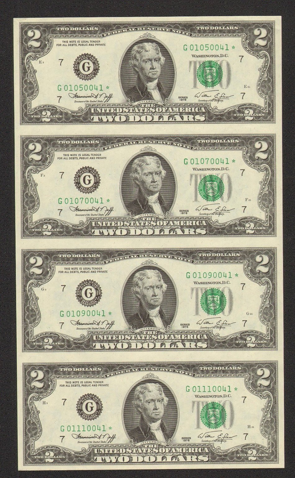 1976 $2 Federal Reserve 4 Note Uncut Star Sheet G* Chicago Illinois S/N G01050041*