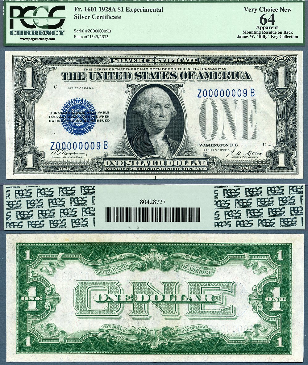 This historical serial #000000009 "Experimental Set" of Silver Certificates. The entire first three packs of each block (X-B, Y-B and Z-B) were purchased by Aubrey & Adeline Bebee in the 1950s and closely held until they finally decided to sell off them in three note sets. The first major experimental group of small notes was printed in November 1932 and delivered to the Treasury for release into circulation January and February of 1933, during the period of the $1.00 Series 1928A and 1928B. The experimental set was to determine the effect of changing the relative amounts of linen and cotton fibers. The X-B and Y-B groups were each printed on paper of different portions of rag content with the Z-B group as the control, using the distinctive paper in regular use. $1 1928B Silver Certificate X00000009B PCGS Graded Very Choice New 64 $1 1928A Silver Certificate Y00000009B PCGS Graded Choice New 63 $1 1928A Silver Certificate Z00000009B PCGS Graded Very Choice New 64 USRareCurrency.com Collection