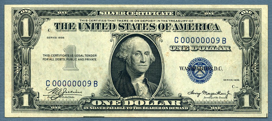 A00000009B, B00000009B, C00000009B Three Note Experimental Set Fr. 1607 $1 1935 Silver Certificates Matching Serial Number 00000009. A neat set with all three blocks for these experimental notes with serial number 00000009. The A-B block utilized distinctive paper with a special finish and was printed from March 16 to April 28, 1937. The B-B block consisted of special paper and its printing was from November 26 to December 10, 1937. The C-B block was printed on regular paper as the control group. Printing for the latter was between December 1 to 10, 1937. The A-B grades Choice CU, the B-B XF with staining, and the C-B grades VF-XF with staining.