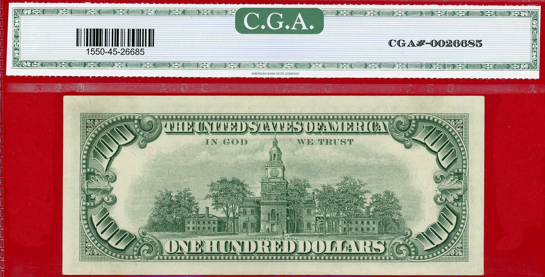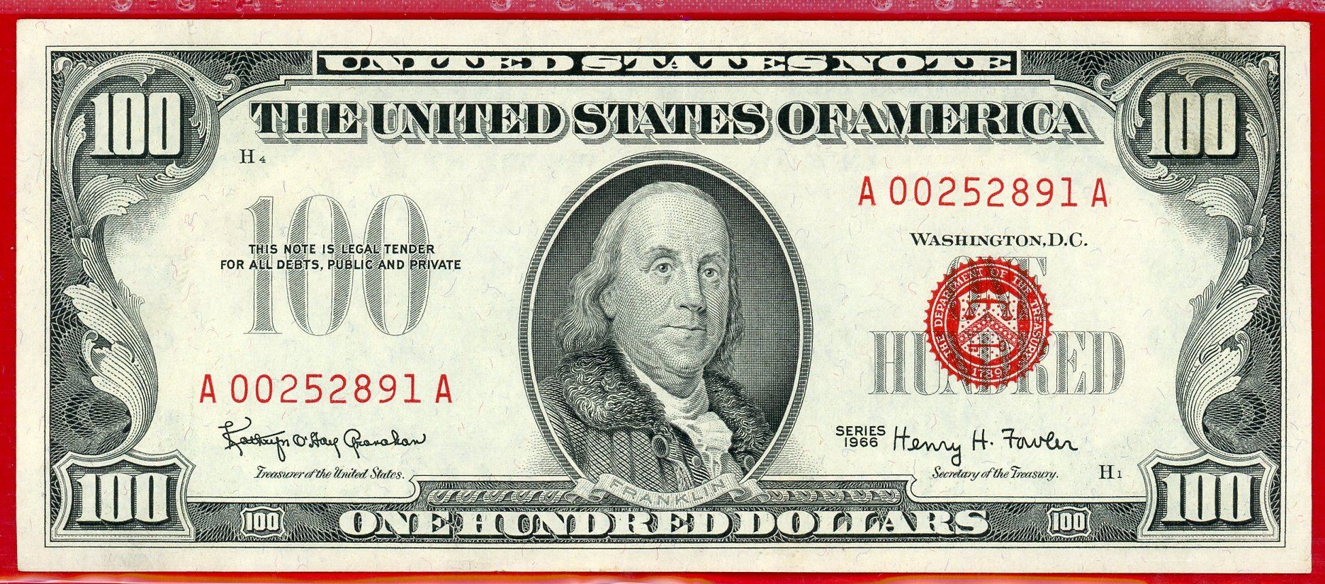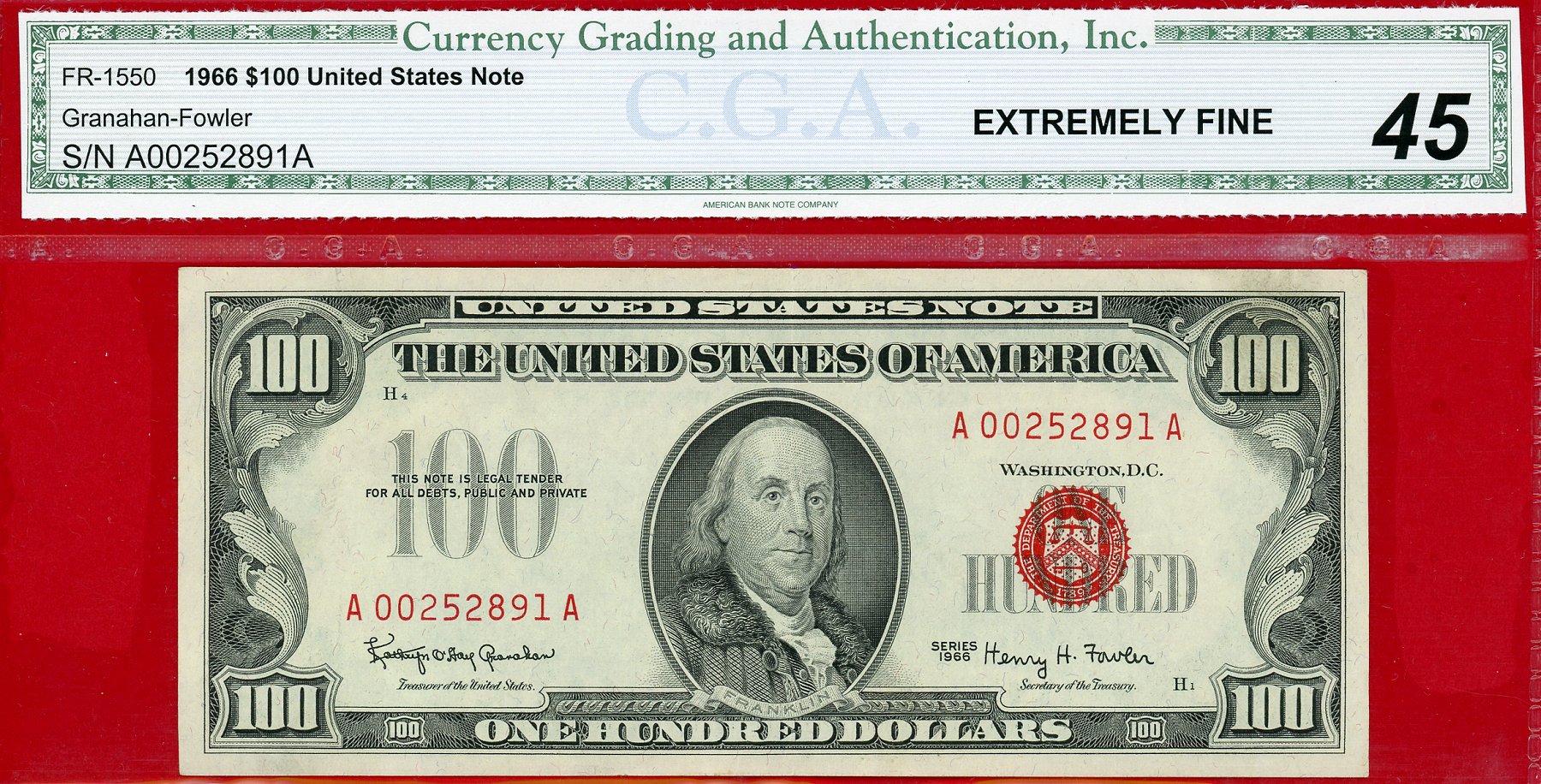 1966 $100 United States Legal Tender Red Seal FR-1550 CGA Graded EF45 S/N A00252891A