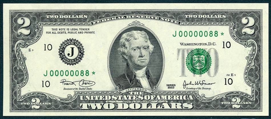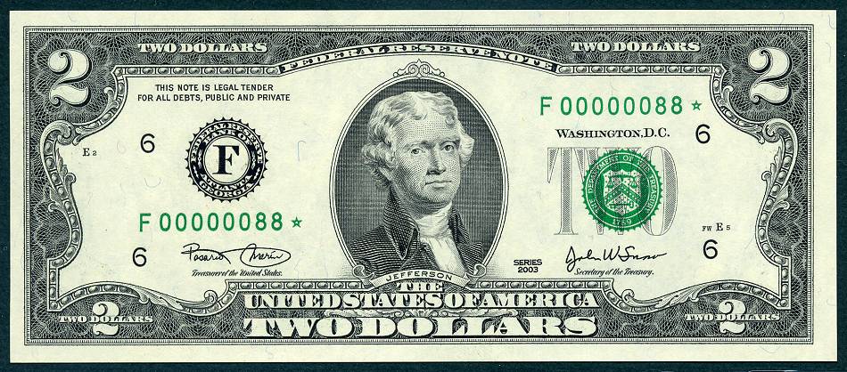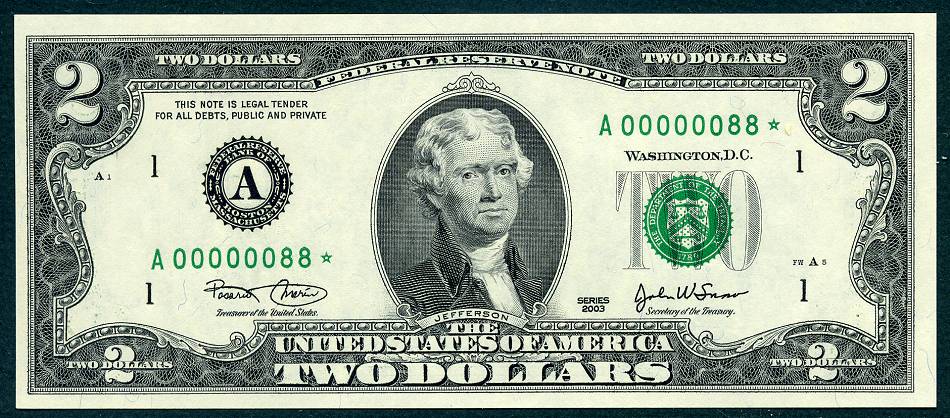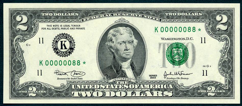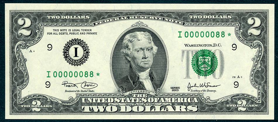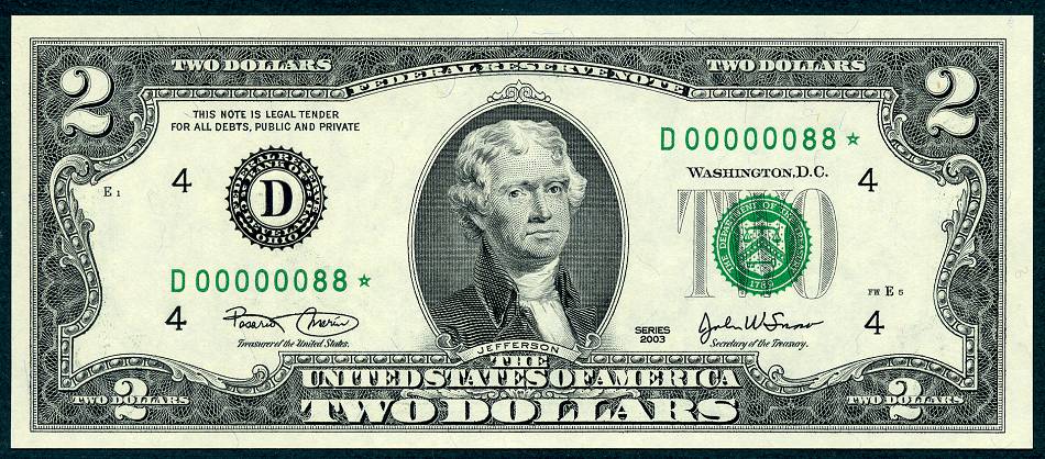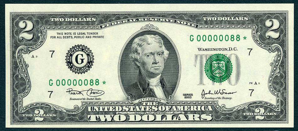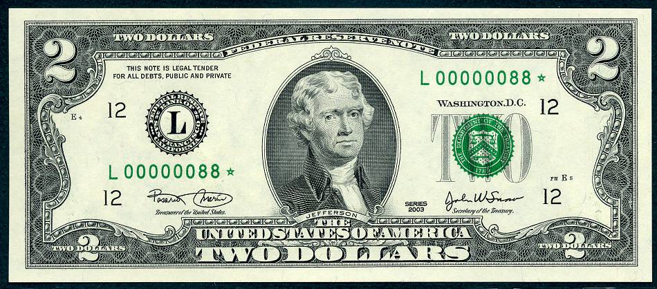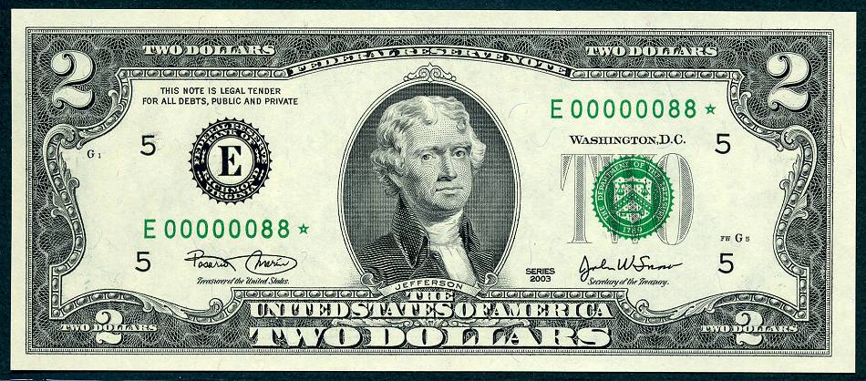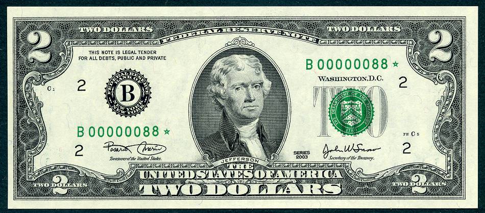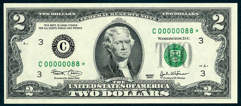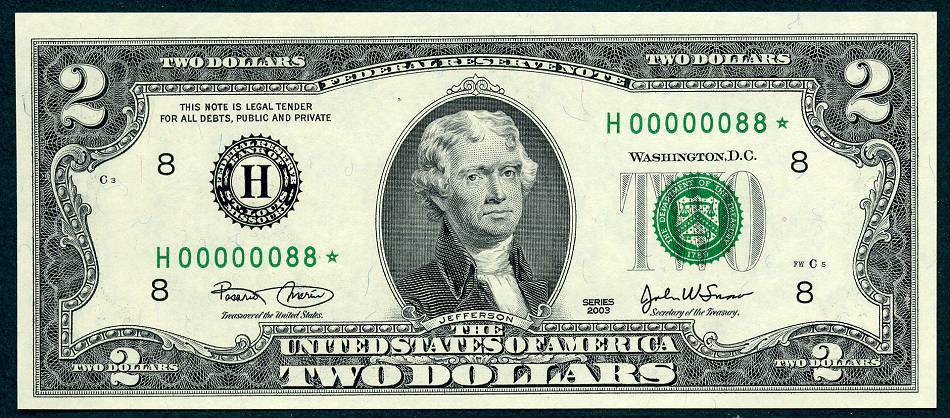 12 Matched Notes All Low Serial Number 88 's One from Each of The Twelve Districts All Star Notes These Sets Sold Out In A Record 5 Days @ The BEP The Bureau of Engraving and Printing proudly presented this unique premium set of Series 2003 $2 matching notes. This is a limited edition set – only 2,000 world wide were produced. They feature a collection of 12 Series 2003 $2 STAR notes one each from the 12 Federal Reserve Banks. This remarkable set is handsomely bound and contains for the first time ever, STAR notes with the Lowest Matching Serial Numbers available commencing with 00000001*. *The serial number range for this limited-edition Series 2003 $2 Fed Set was 00000001 - 00002100. Due to quality standards during the manufacturing process some serial numbers were not made available this is why you will see numbers up to 2100. Please Remember you get Twelve Notes one from each district, all with the same serial Number 88*