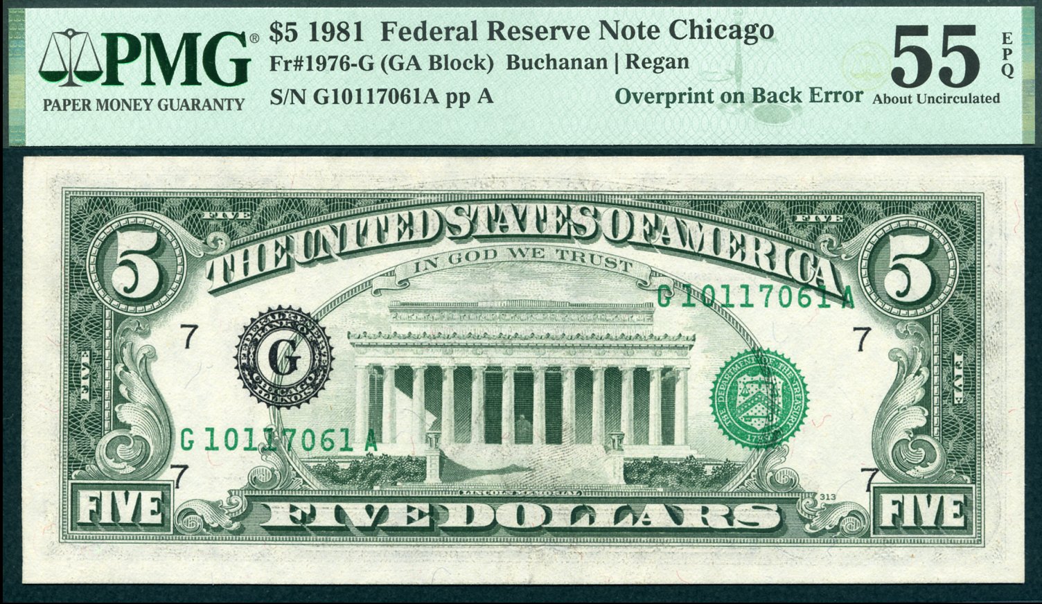 1981 $5 Federal Reserve Note Third Print Overprint on Back Error PMG AU55EPQ S/N G10117061A