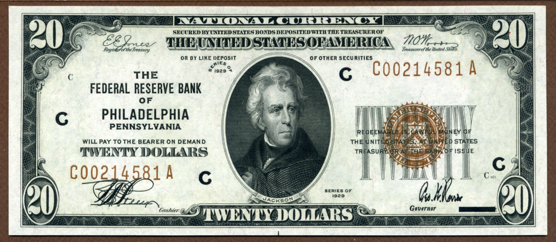 1929 $20 FRBN FR-1870-C Philadelphia Pennsylvania PCGS Banknote Choice Unc 64 S/N C00214581A
