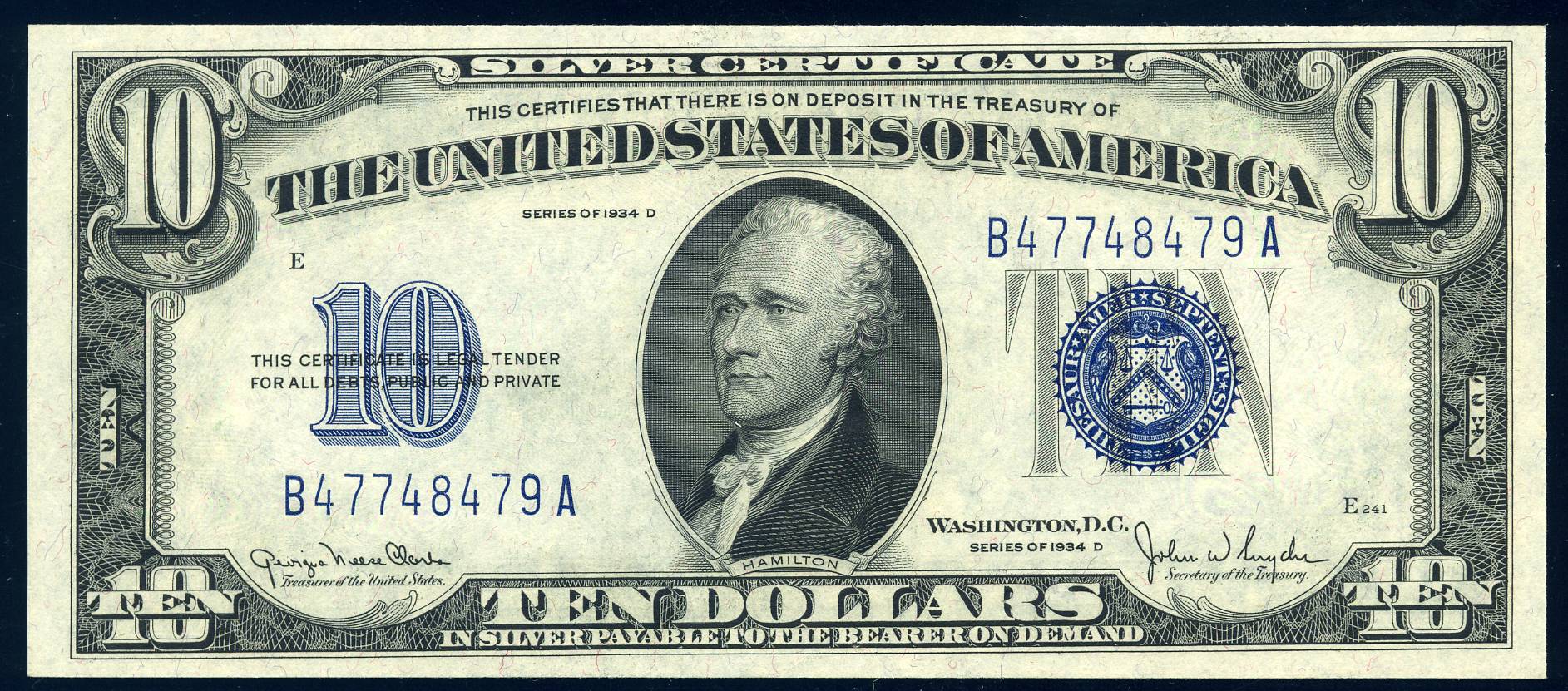 1934D $10 Silver Certificate FR-1705w Wide PCGS CU64PPQ S/N B47748479A