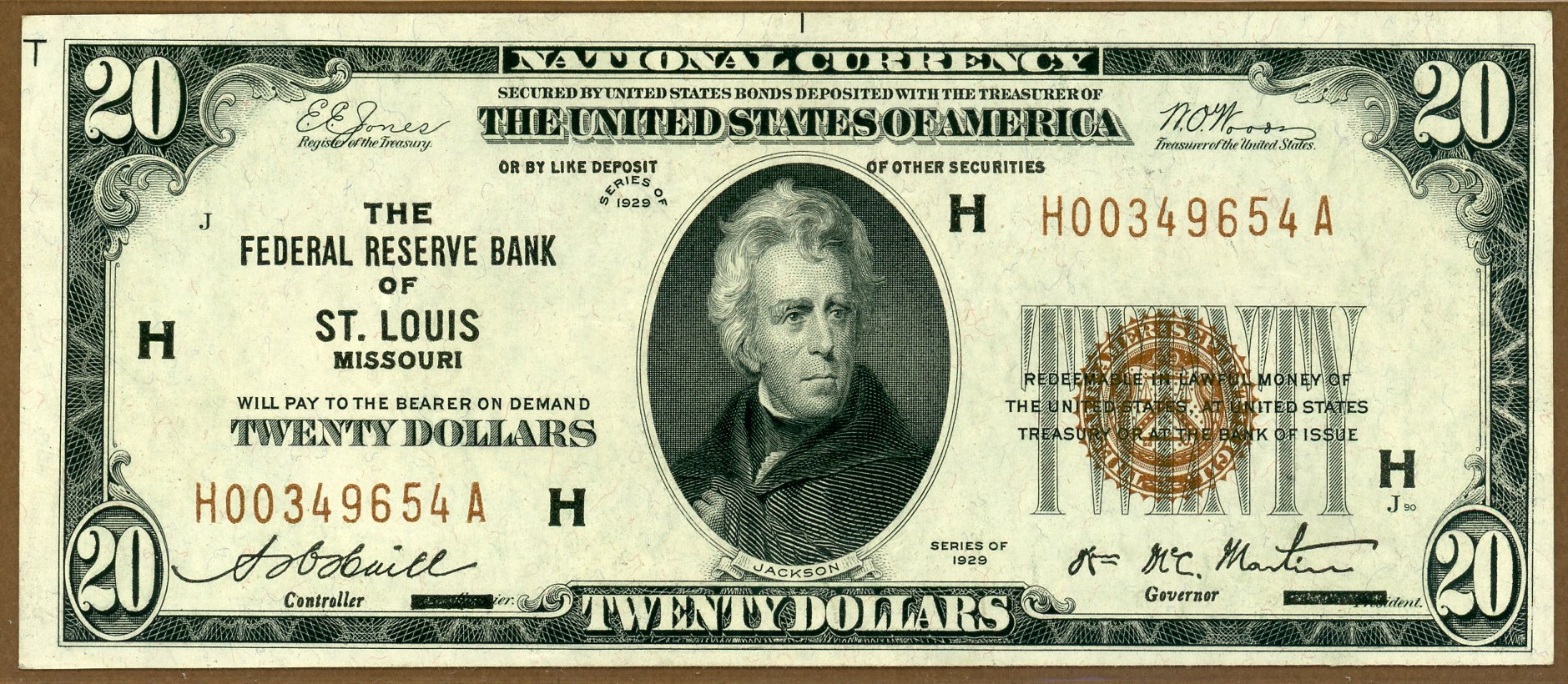 1929 $20 Federal Reserve Bank Note FR-1870-H St Louis S/N H00349654A