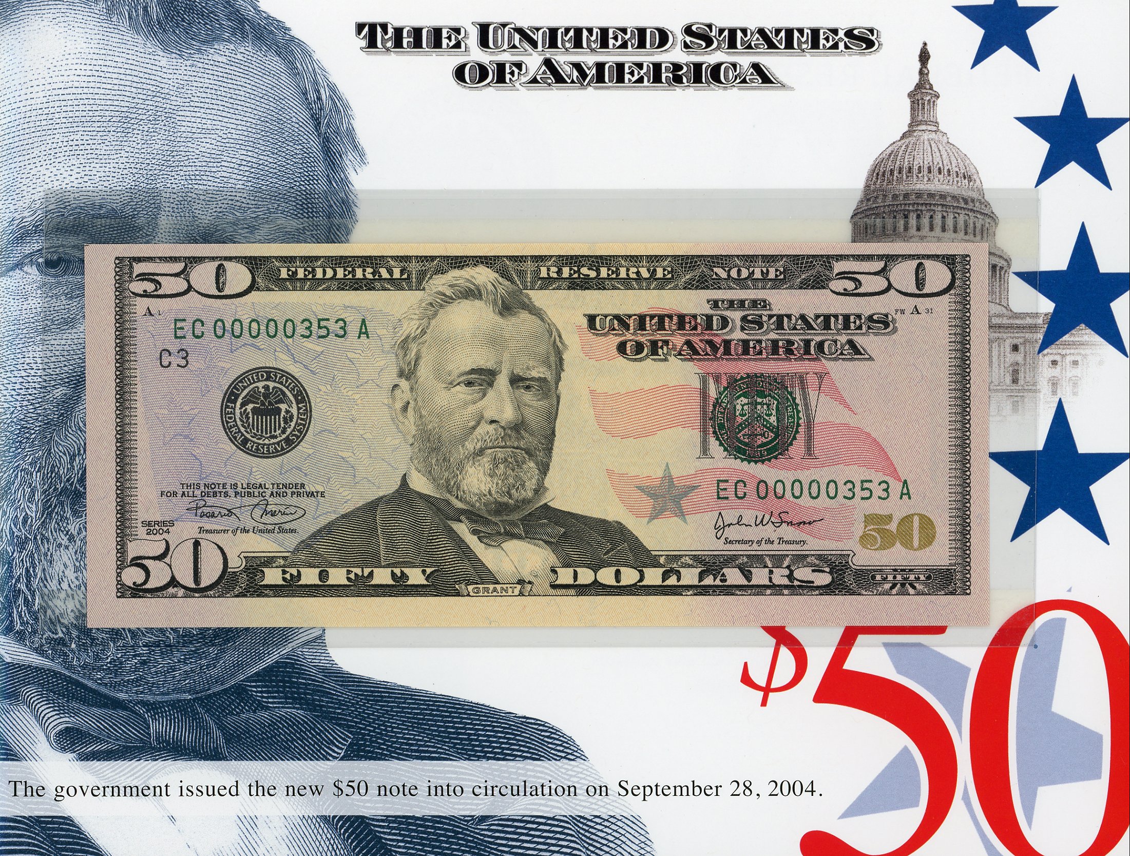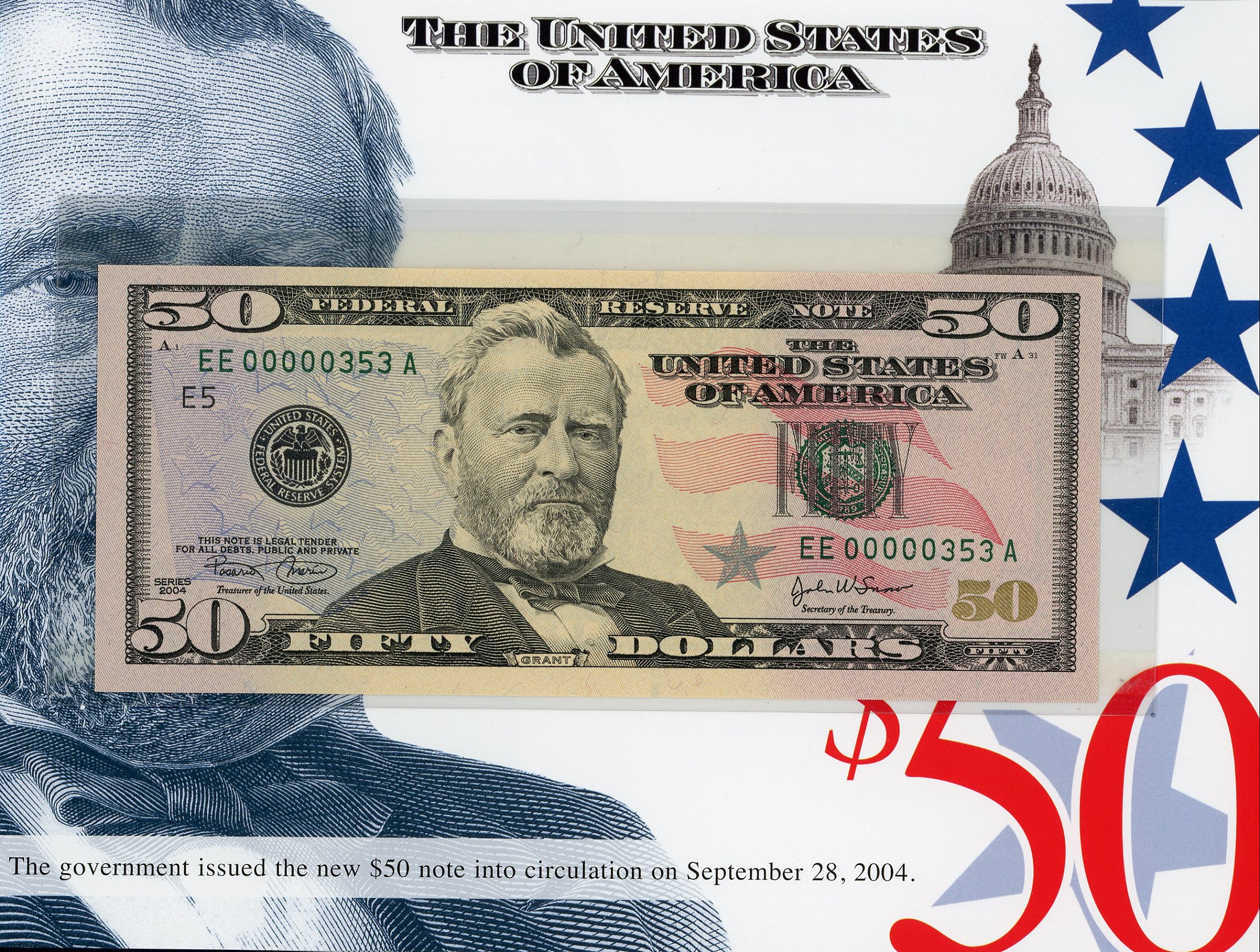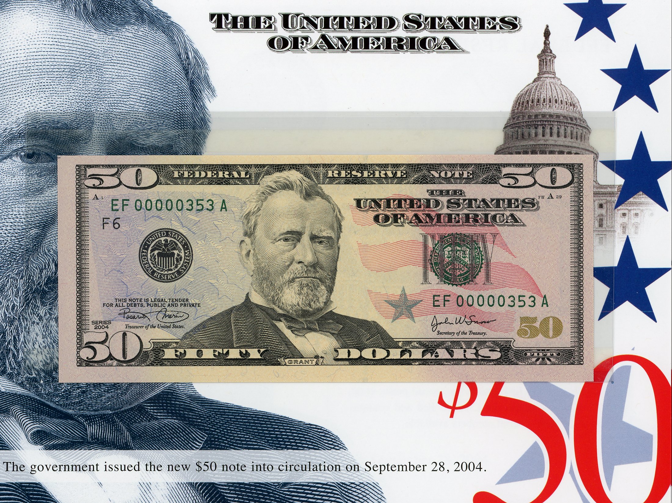 Set #353 the 3rd Set Printed, These exclusive sets, for the first time ever, features crisp uncirculated Series 2004 $50 notes with MATCHING LOW SERIAL NUMBERS. This is a limited edition set – only 500 worldwide were printed and sold by the BEP. There is a collection of 12 Series 2004 notes, one from each of the 12 Federal Reserve Banks. Serial Numbers started a number 351 and continued thru 851. These Sets Sold Out within one hour at the BEP!!