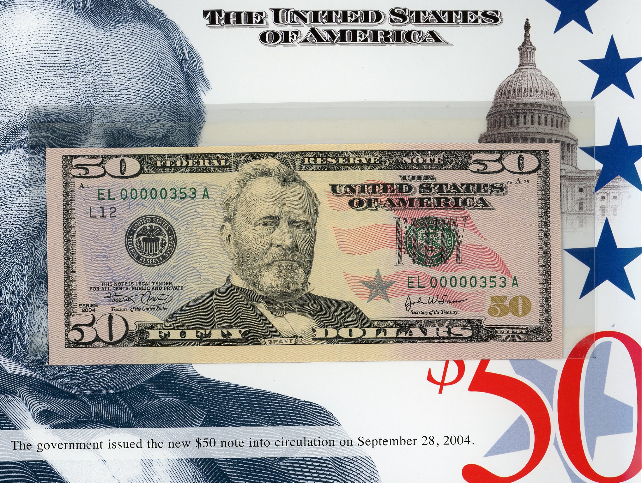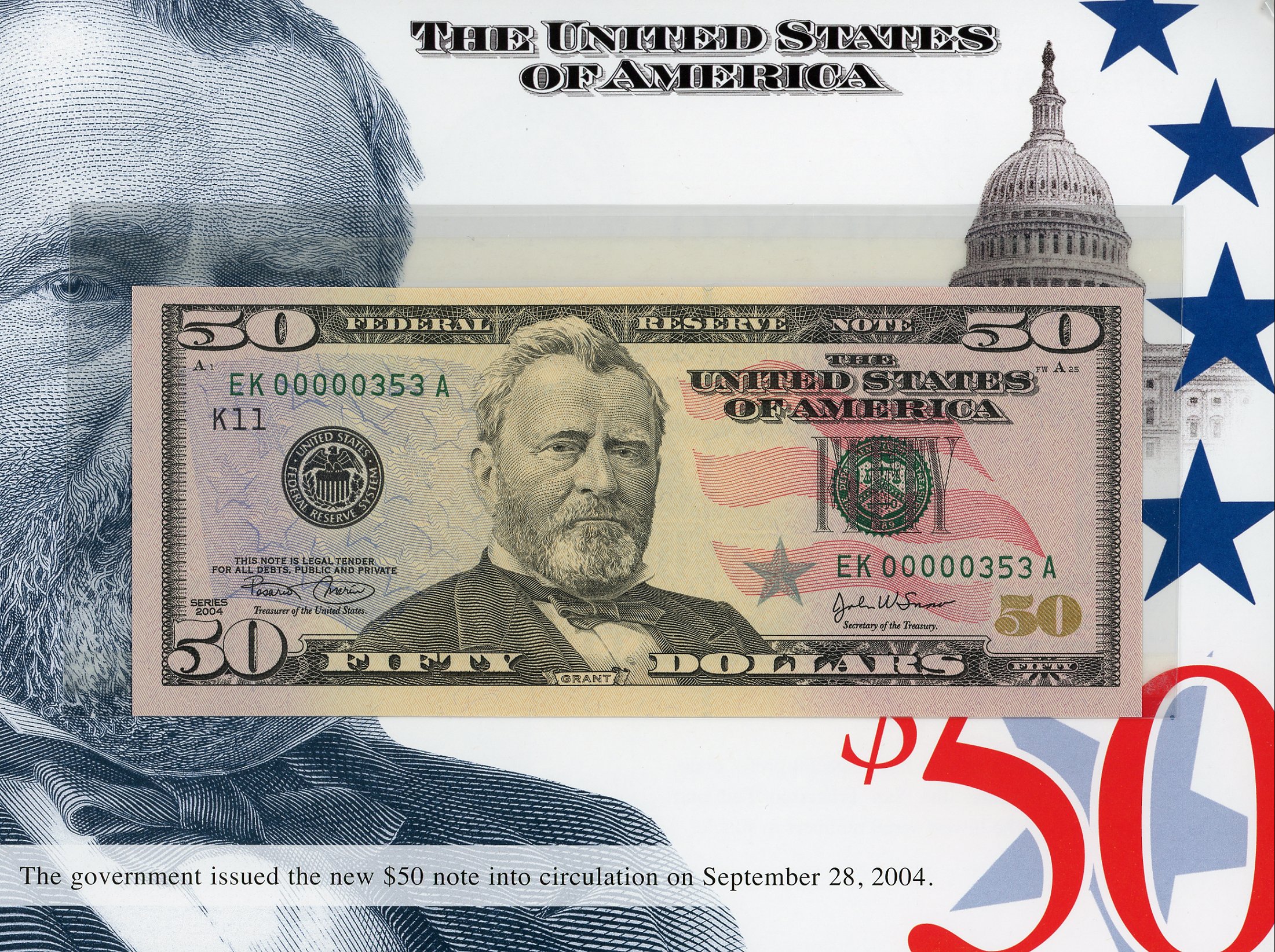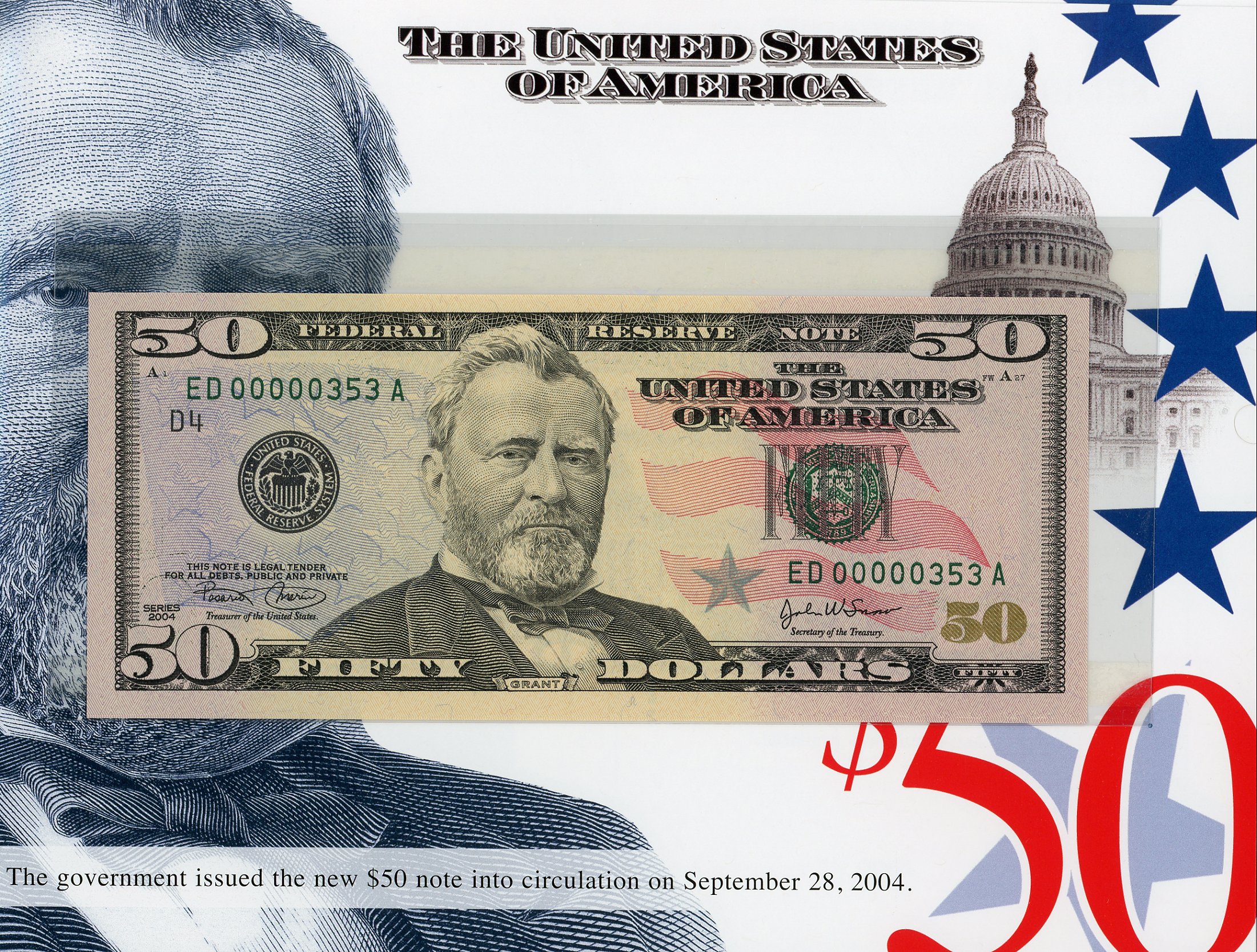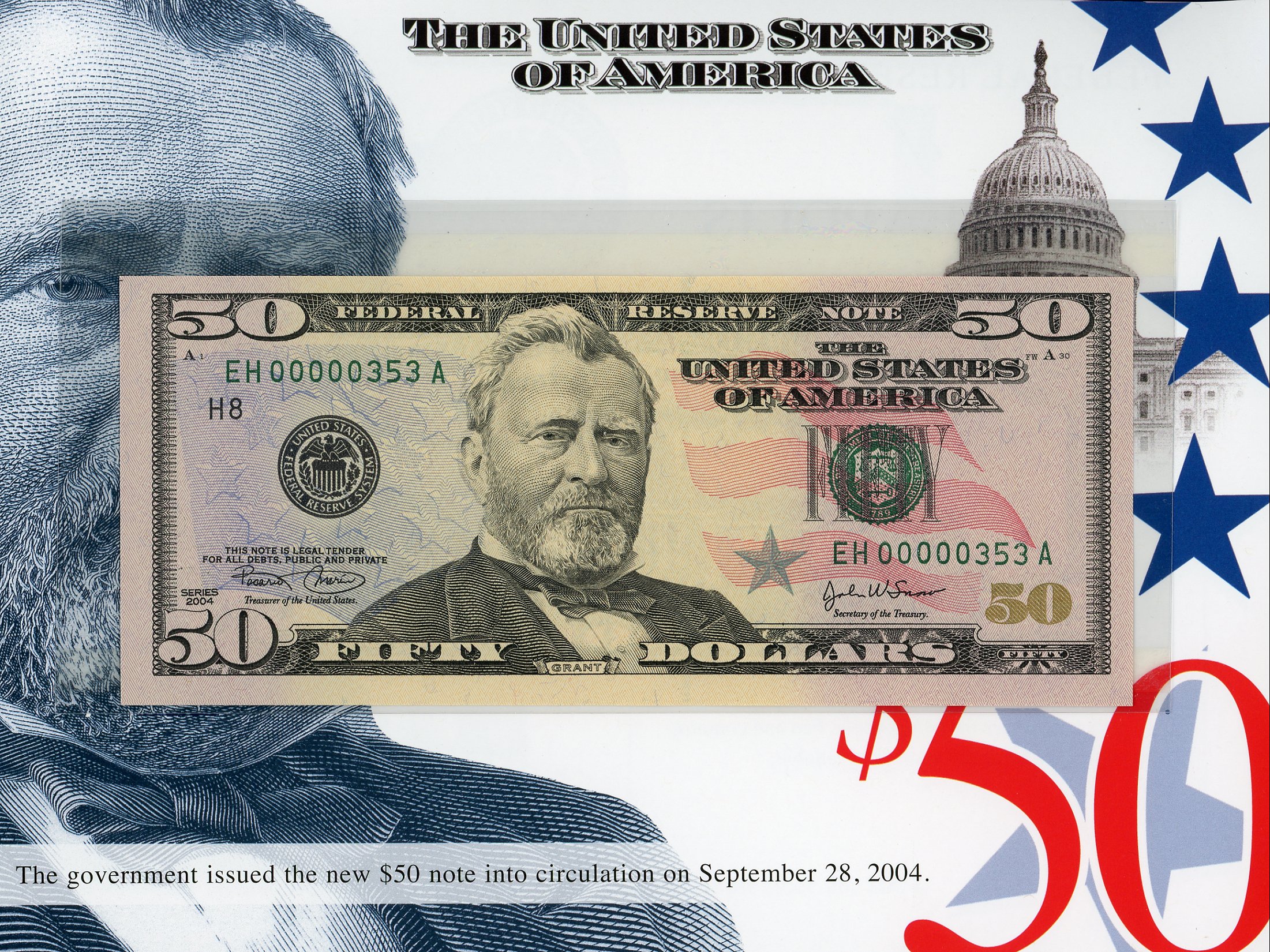 Set #353 the 3rd Set Printed, These exclusive sets, for the first time ever, features crisp uncirculated Series 2004 $50 notes with MATCHING LOW SERIAL NUMBERS. This is a limited edition set – only 500 worldwide were printed and sold by the BEP. There is a collection of 12 Series 2004 notes, one from each of the 12 Federal Reserve Banks. Serial Numbers started a number 351 and continued thru 851. These Sets Sold Out within one hour at the BEP!!