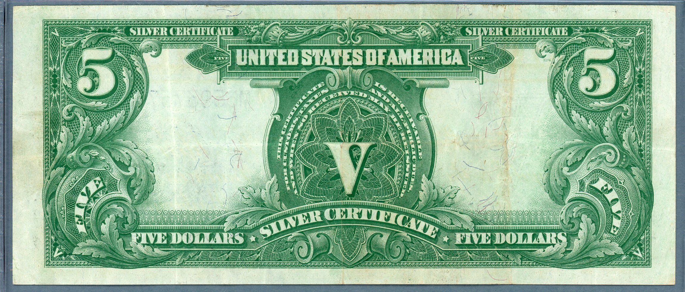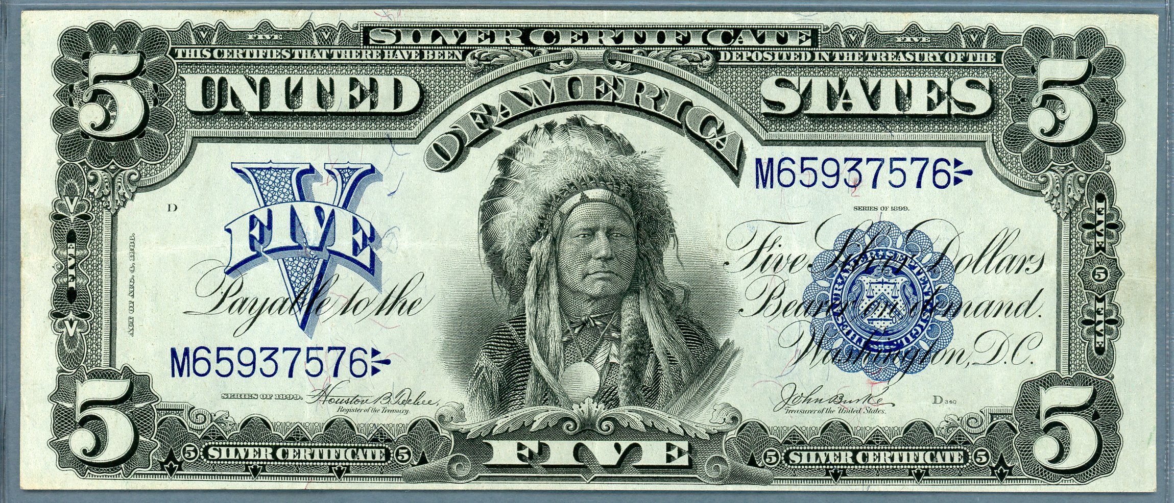 S/N M65937576 One of the most popular Large Size Type notes displays the portrait of Ta-to-ka-in-yan-ka also known as Chief Running Antelope. He was the chief of the Oncpapa or Huncpapa Tribe of the Sioux Nation. George F. Smille, who engraved many of our most beautiful pieces of currency, engraved the portrait and requested the Chief wear his war bonnet. He refused, deeming it inappropriate, so a war bonnet from the opposing Pawnee Nation was substituted in the engraved portrait. This $5 silver certificate is the only piece of US paper money issued for general circulation that uses a Native American as the central vignette.