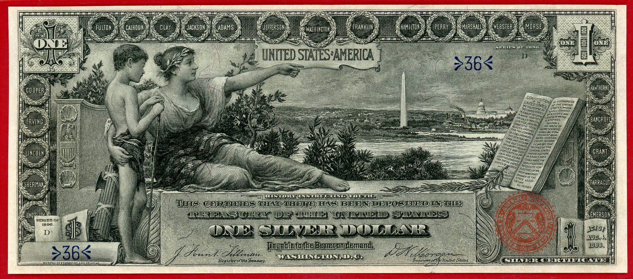 S/N 36 Low Fancy 2 Digit Serial Number Very Hard to Come on this Series only a few available to the public with Low Serial Numbers. The Front of the Note was designed by Will H. Low and engraved by Charles Schlecht. History instructing youth to the left to the right the Constitution, in the background the Washington Monument and the Capitol, around the borders the names of great Americans in wreaths. Educational Series Note.