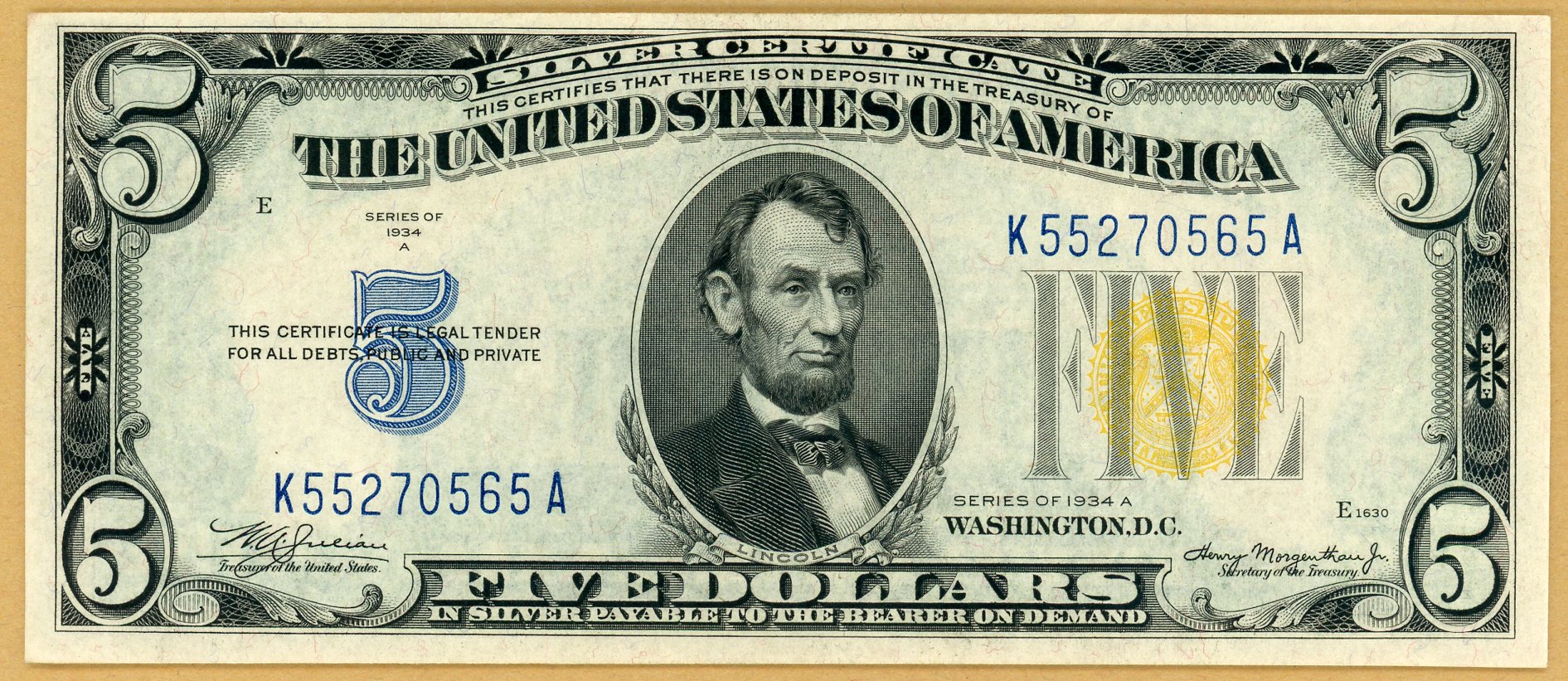 1934A $5 North Africa Silver Certificate FR-2307 PCGS B CU64PPQ S/N K55270565A